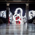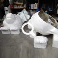 Fashion Week automne/hiver 2014-2015, Palais de Tokyo, Paris. Taille directe de polystyrène, recouvert de slastic peint. Travail collectif en atelier à 6 sculpteurs (avant peinture) .